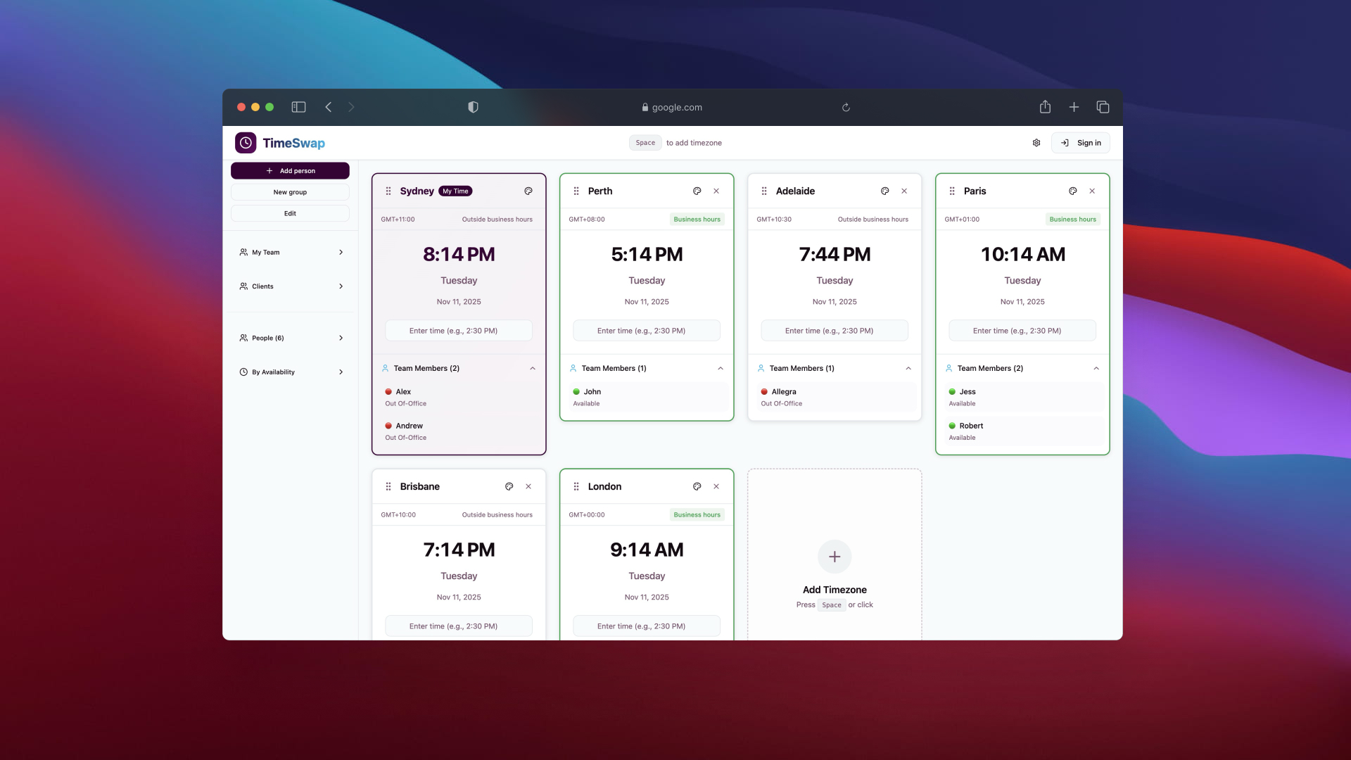 TimeSwap enables professionals working across regions to compare multiple time zones simultaneously, reducing friction and uncertainty when scheduling meetings.